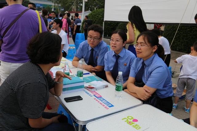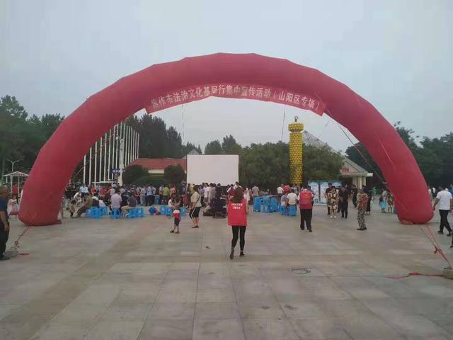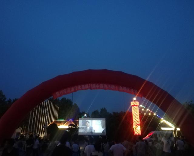 7月18日下午6點剛過,焦作市龍源湖北廣場,在象征奮斗拼搏精神的夸父逐日巨大城市雕塑下,沒了往日喧囂的廣場舞旋律和舞動的大媽,換成了高高拱起的巨型彩虹門,巨大的電影幕布矗立在彩虹門后面廣場中央,大媽、大叔、放假的孩子、游園的青年人三五群聚攏在幕布前一長溜的條桌前,像去趕集一樣熙熙攘攘,樂此不疲。這里正在舉行焦作市法治文化基層行集中宣傳活動山陽區(qū)專場,其中第一部分法治咨詢活動正在進(jìn)行中。龍源湖北廣場緊鄰著山陽區(qū)嘉隆社區(qū)、恩華社區(qū)和郝杰社區(qū),是附近群眾游玩健身集會的大型場所。