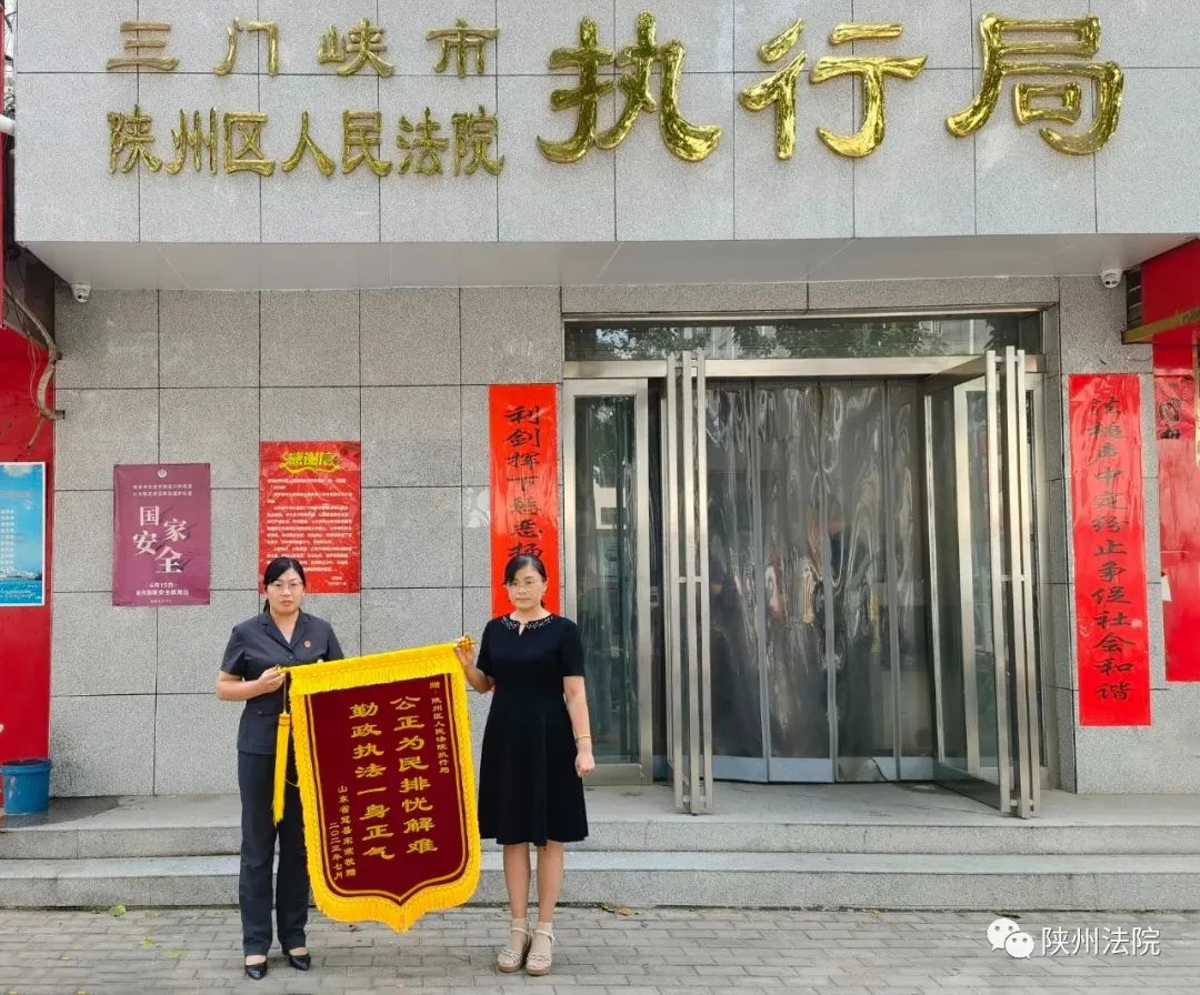 “公正為民排憂解難,勤政執(zhí)法一身正氣?!?/span>7月27日,三門峽市陜州區(qū)人民法院協(xié)助山東省冠縣人民法院成功執(zhí)結(jié)一起買賣合同糾紛案件,申請執(zhí)行人宋某將錦旗送到陜州法院執(zhí)行局負(fù)責(zé)人手中,對陜州法院盡心盡力盡責(zé)的協(xié)助執(zhí)行行為表示誠摯感謝!