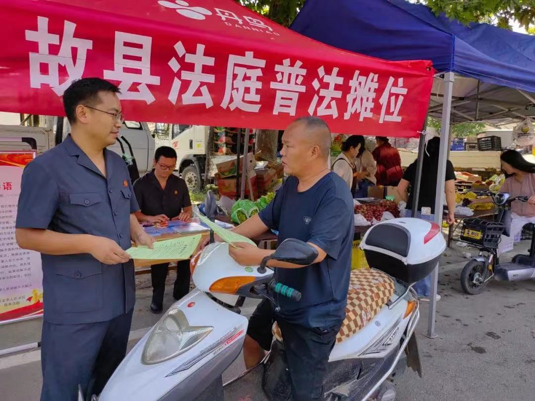 上午10點,正是故縣集市最熱鬧的時候,擺放著各類普法宣傳冊的“普法小地攤”吸引了廣大群眾的駐足,大家翻閱著《民間借貸訴訟指導(dǎo)》 《防電信詐騙宣傳手冊》 《河南移動微法院》 等各類普法宣傳小冊子及宣傳彩頁。