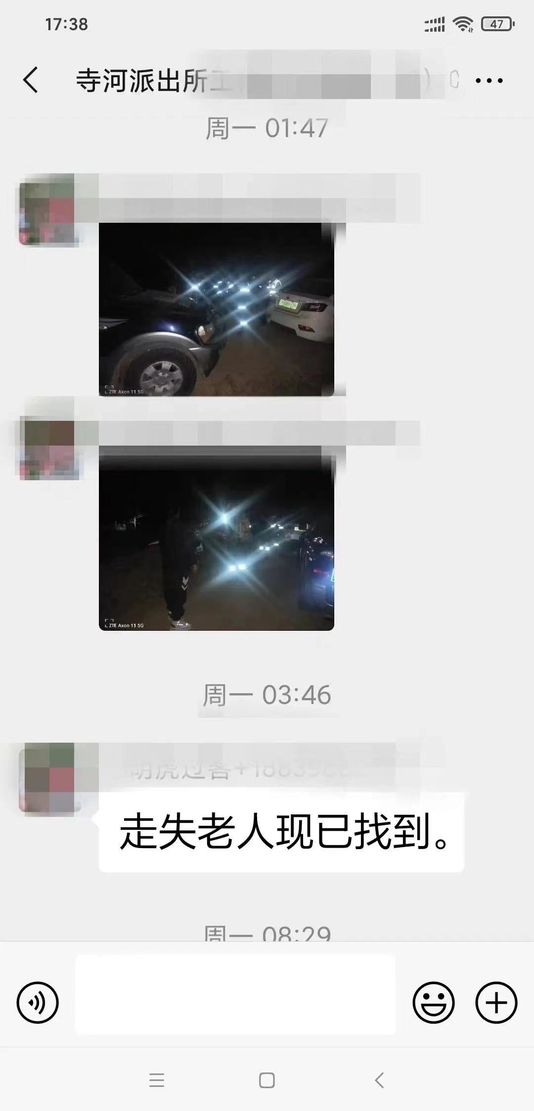 經(jīng)詢問報(bào)警人得知,走失人員系其母親,年歲已高且沉默寡言,同時(shí)民警又詳細(xì)詢問了老人的體貌特征。由于暮色已至,為盡快找到走失老人,民警線上線下聯(lián)動(dòng),一方面立即組織附近村組干部在老人走失地周邊尋找,另一方面利用“一村一警”微信矩陣群發(fā)布尋人信息,進(jìn)行線上尋找。
