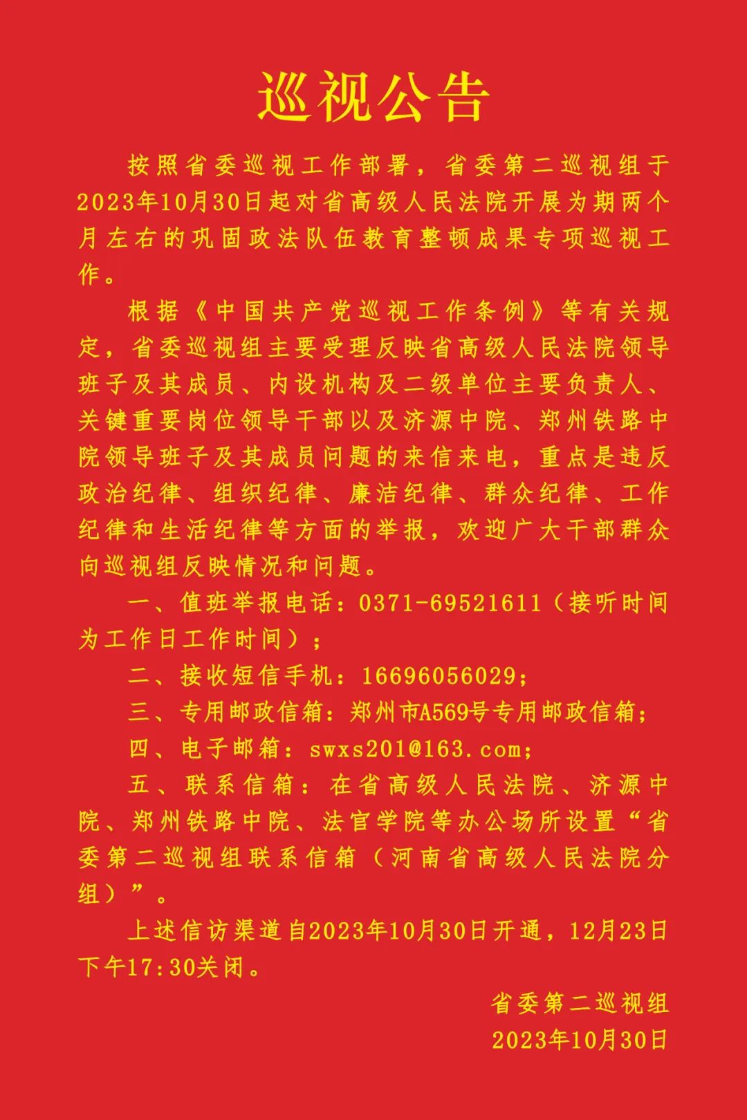 省委第二巡視組對(duì)省高級(jí)人民法院專項(xiàng)巡視公告