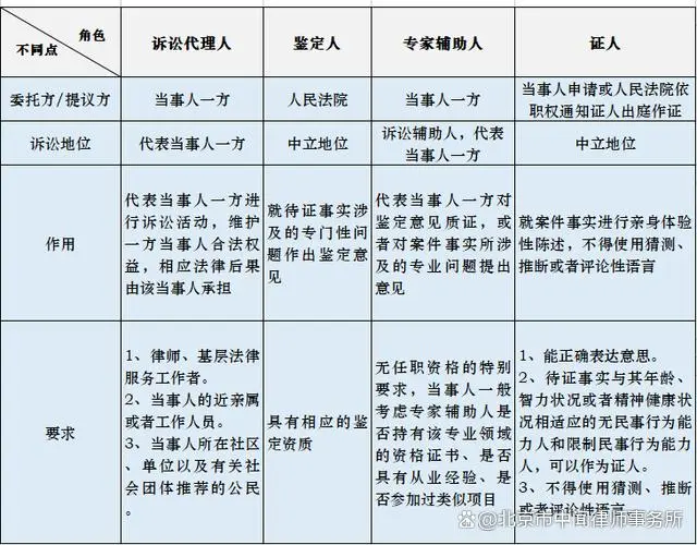 專家輔助人與證人、鑒定人、訴訟代理人具有以下不同點(diǎn):