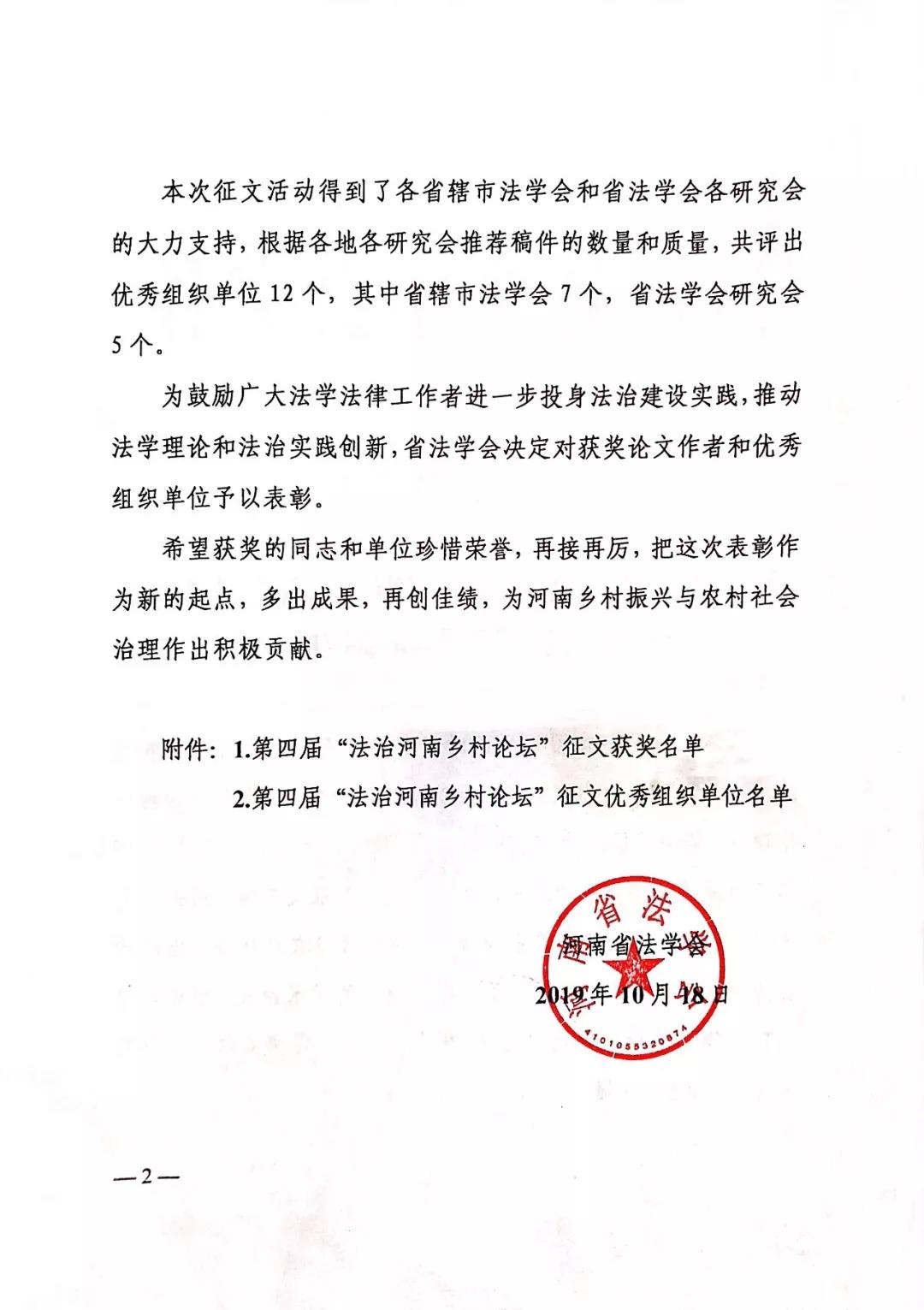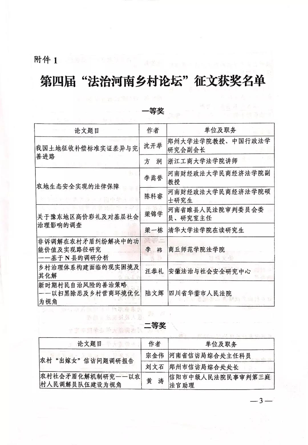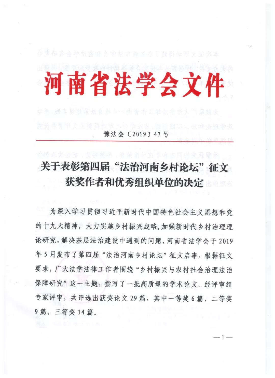 為深入學(xué)習(xí)貫徹習(xí)近平新時(shí)代中國特色社會(huì)主義思想和黨的十九大精神,大力實(shí)施鄉(xiāng)村振興戰(zhàn)略,加強(qiáng)新時(shí)代鄉(xiāng)村治理理論研究,解決基層法治建設(shè)中遇到的問題,河南省法學(xué)會(huì)于2019年5月發(fā)布了第四屆“法治河南鄉(xiāng)村論壇”征文啟事,根據(jù)征文要求,廣大法學(xué)法律工作者圍繞“鄉(xiāng)村振興與農(nóng)村社會(huì)治理法治保障研究”這一主題,撰寫了一批高質(zhì)量的學(xué)術(shù)論文。經(jīng)評審組專家評審,共評選出獲獎(jiǎng)?wù)撐?9篇,其中一等獎(jiǎng)6篇,二等獎(jiǎng)9篇,三等獎(jiǎng)14篇。