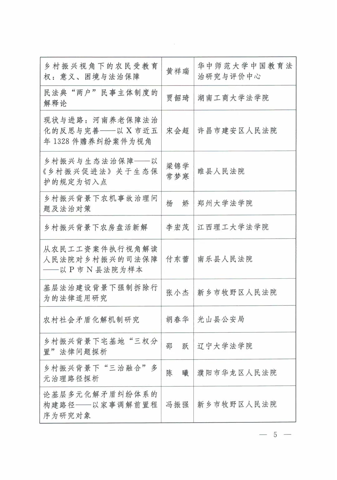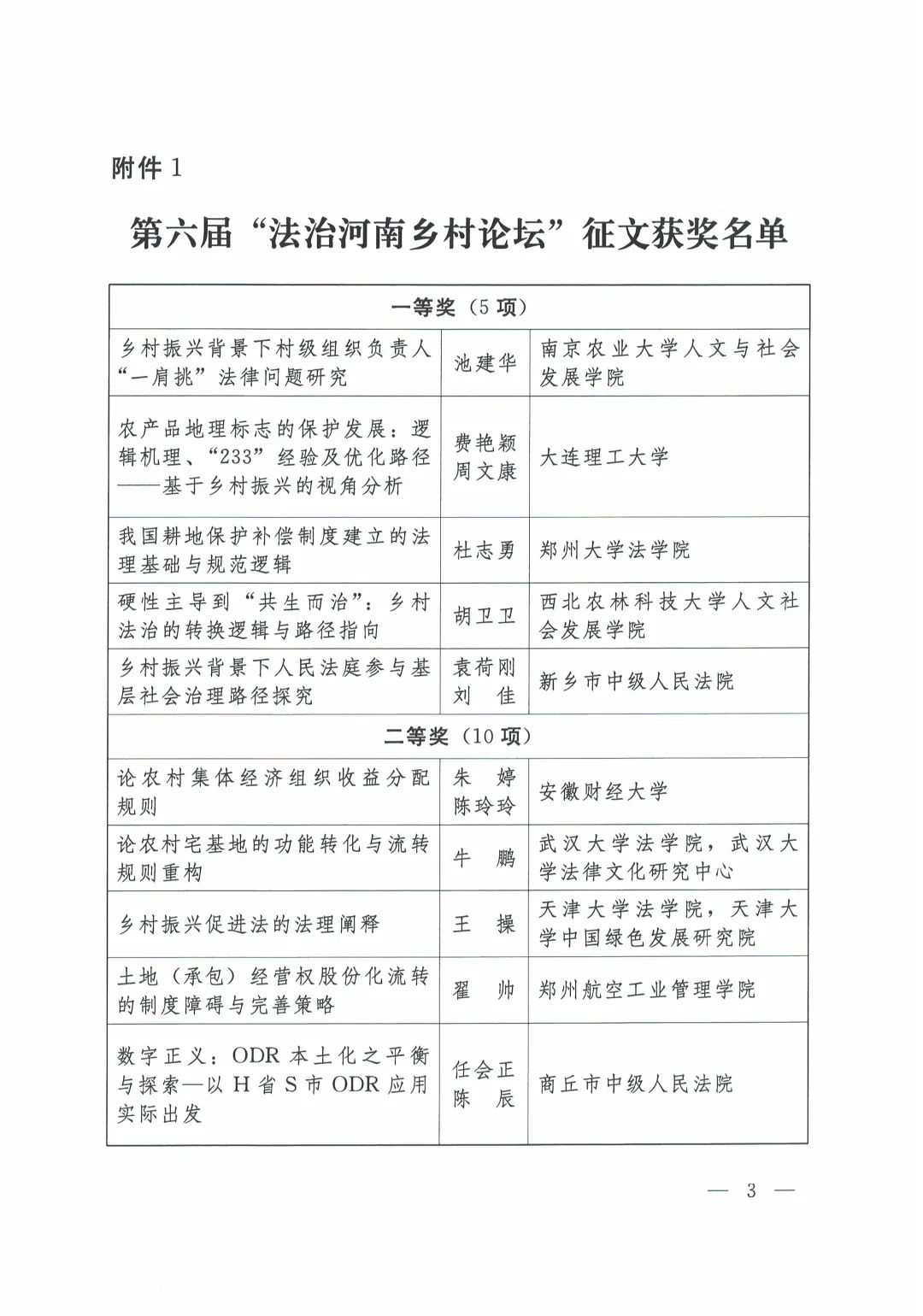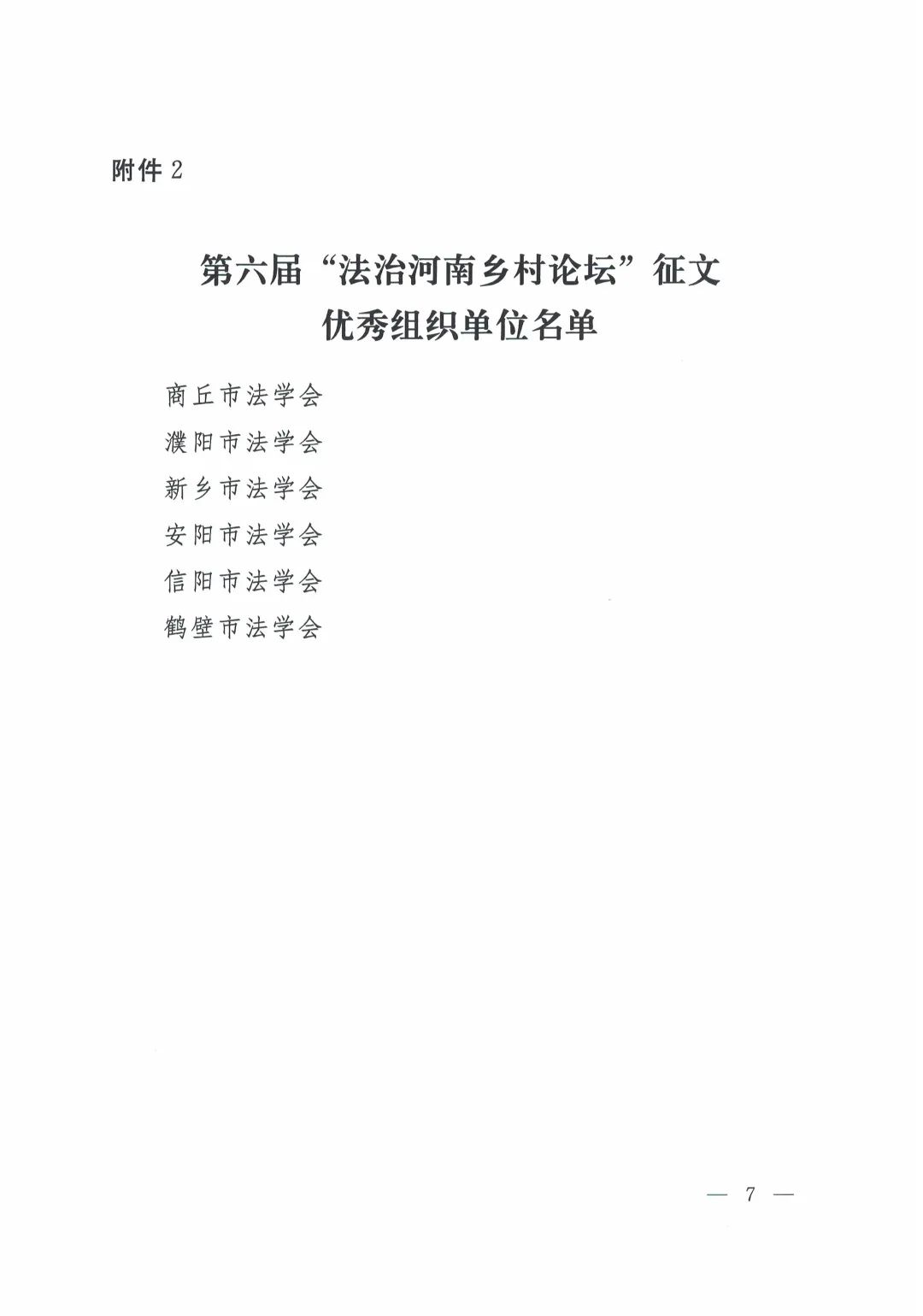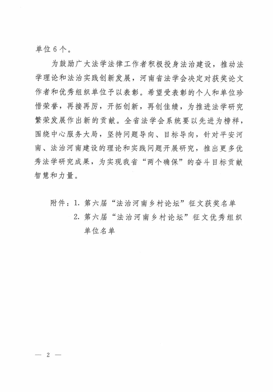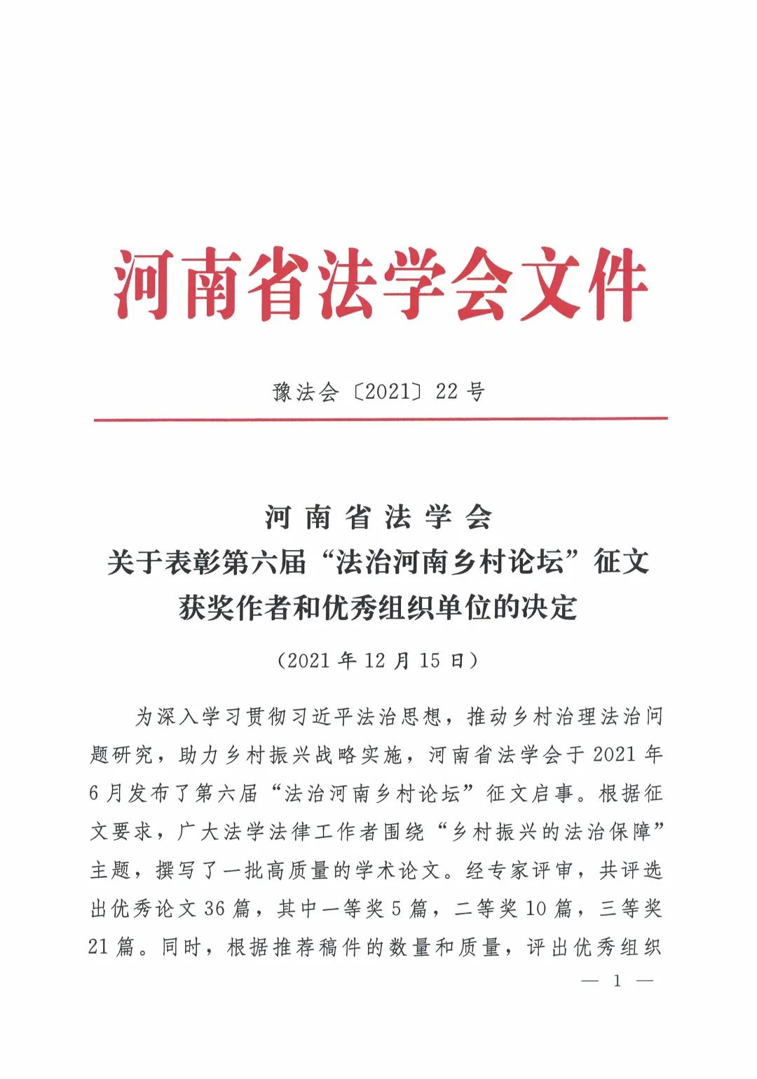 為深入學(xué)習(xí)貫徹習(xí)近平法治思想,推動鄉(xiāng)村治理法治問題研究,助力鄉(xiāng)村振興戰(zhàn)略實(shí)施,河南省法學(xué)會于2021年6月發(fā)布了第六屆“法治河南鄉(xiāng)村論壇”征文啟事。根據(jù)征文要求,廣大法學(xué)法律工作者圍繞“鄉(xiāng)村振興的法治保障”主題,撰寫了一批高質(zhì)量的學(xué)術(shù)論文。經(jīng)專家評審,共評選出優(yōu)秀論文36篇,其中一等獎5篇,二等獎10篇,三等獎21篇。同時,根據(jù)推薦稿件的數(shù)量和質(zhì)量,評出優(yōu)秀組織單位6個。