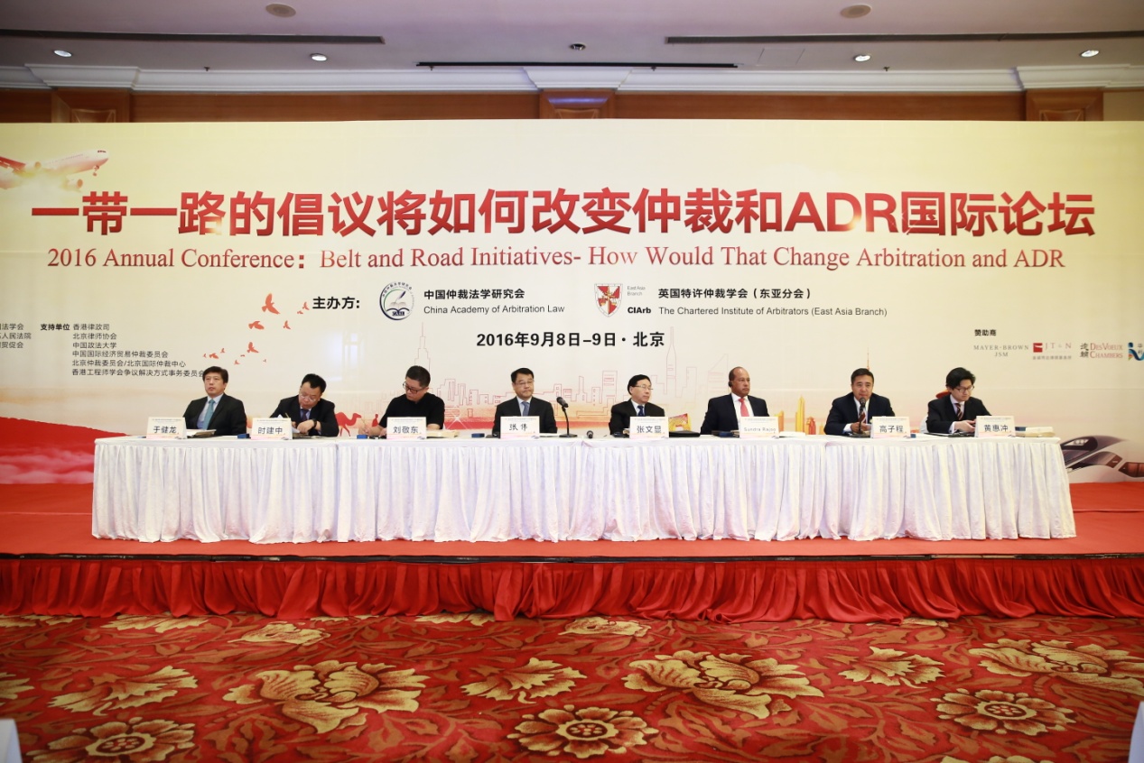 2016年9月8日至9月9日,中國仲裁法學研究會和英國特許仲裁學會在京聯合主辦“一帶一路的倡議將如何改變仲裁和ADR”國際論壇。中國法學會、最高人民法院、中國貿促會領導,香港律政司,北京市律師協(xié)會及來自“一帶一路”沿線國家在京駐華使館經濟官員,歐、美、新加坡、港臺及內陸仲裁專家學者近300人參會。