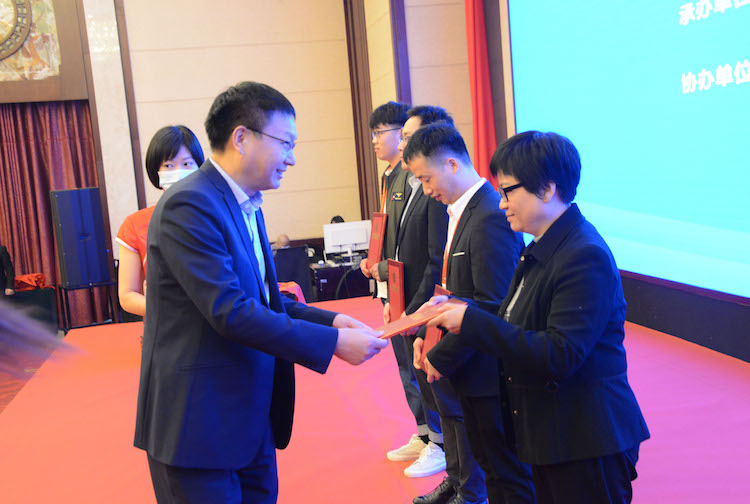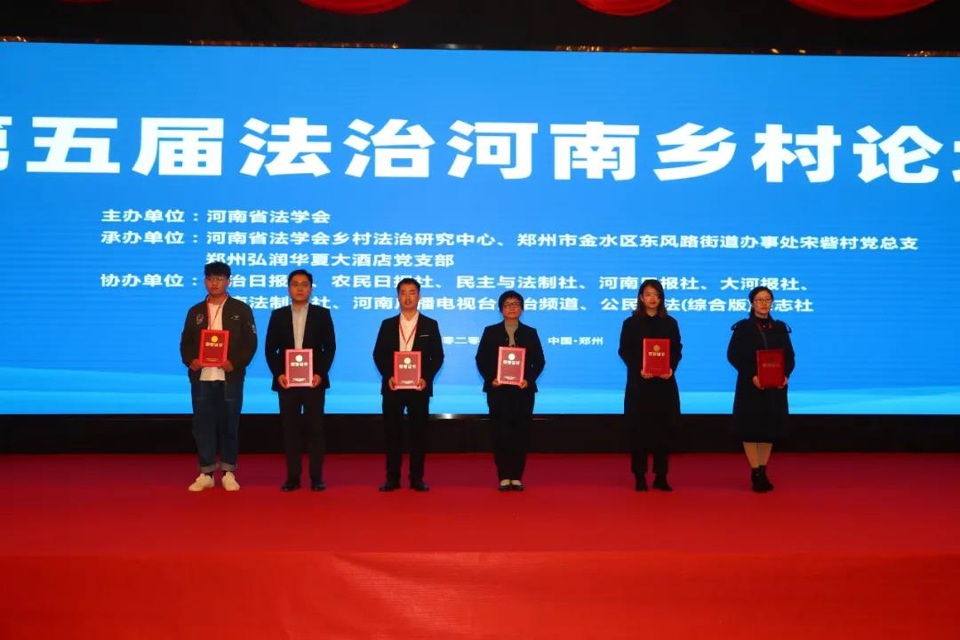 鄭州弘潤華夏大酒店董事長、黨支部書記,省法學會鄉(xiāng)村法治研究中心副秘書長宋智輝為三等獎獲得者代表頒獎