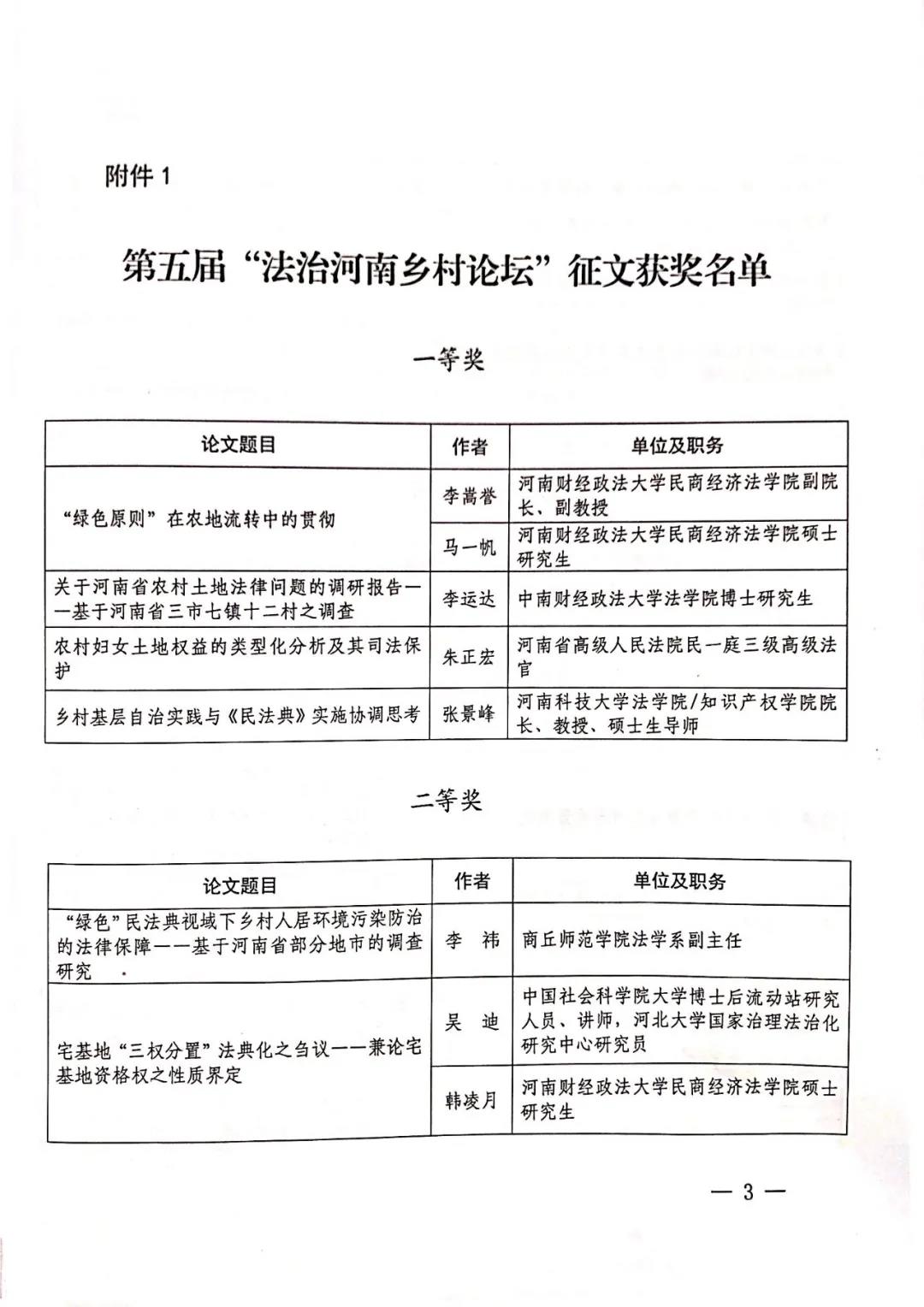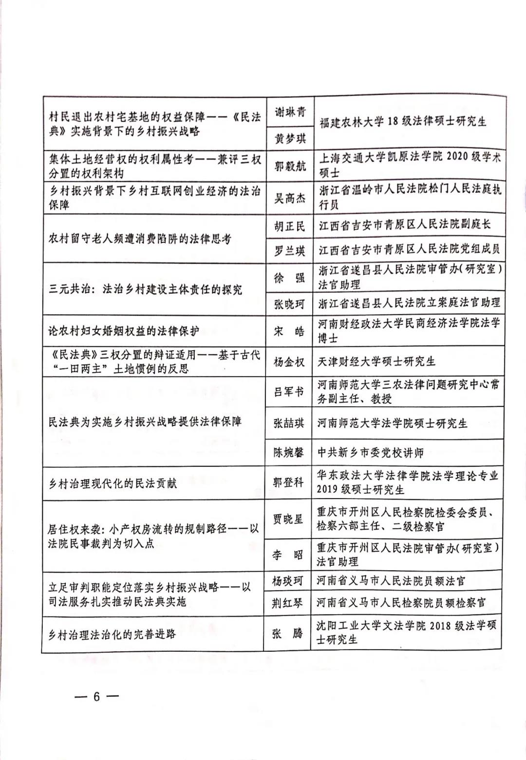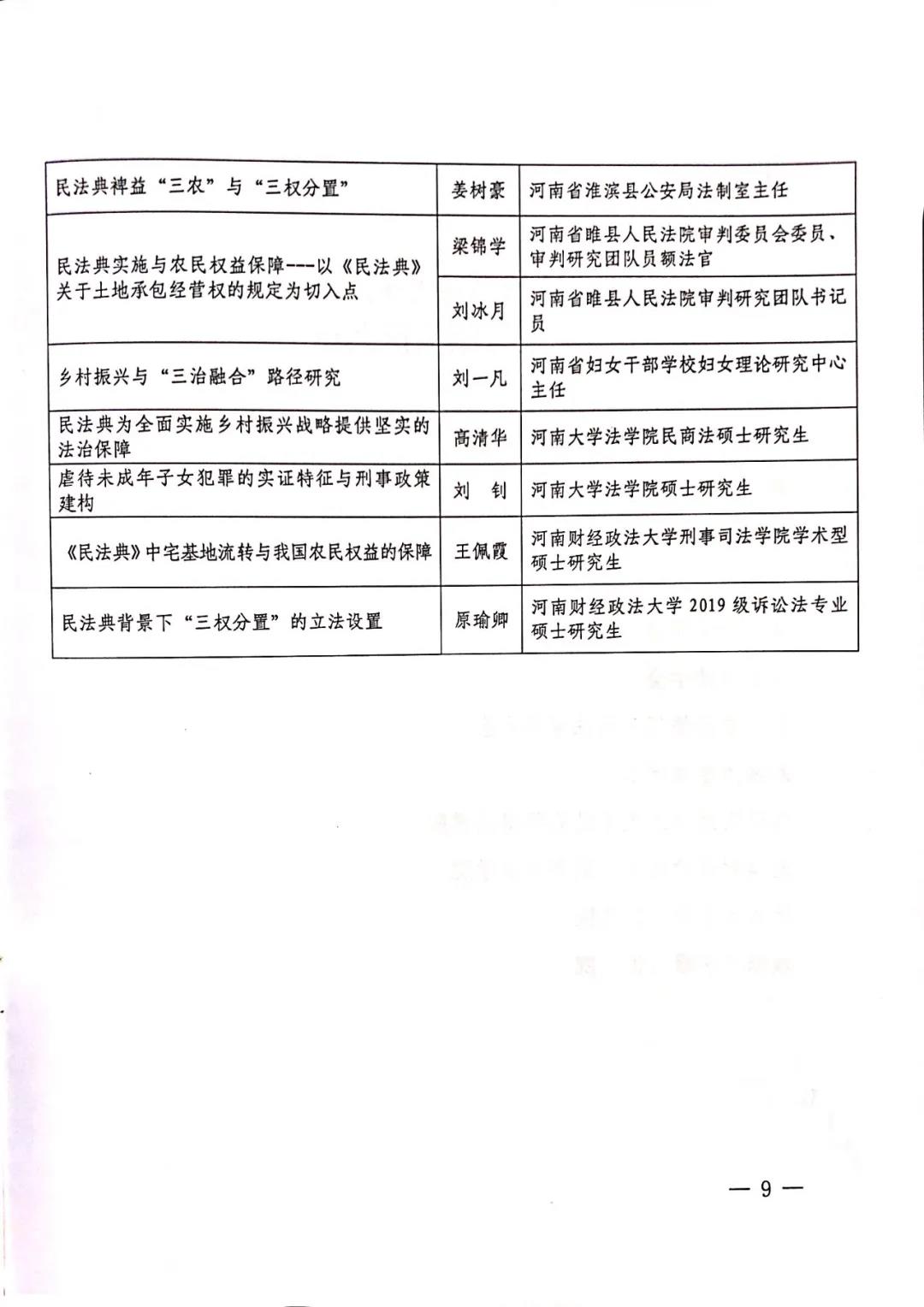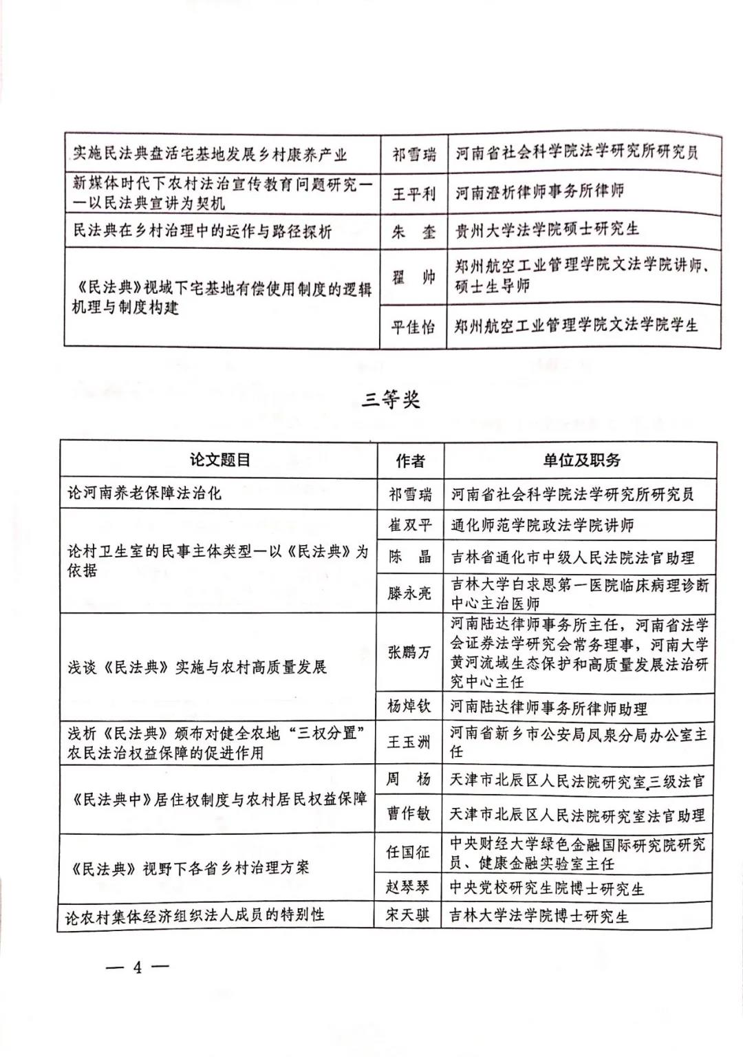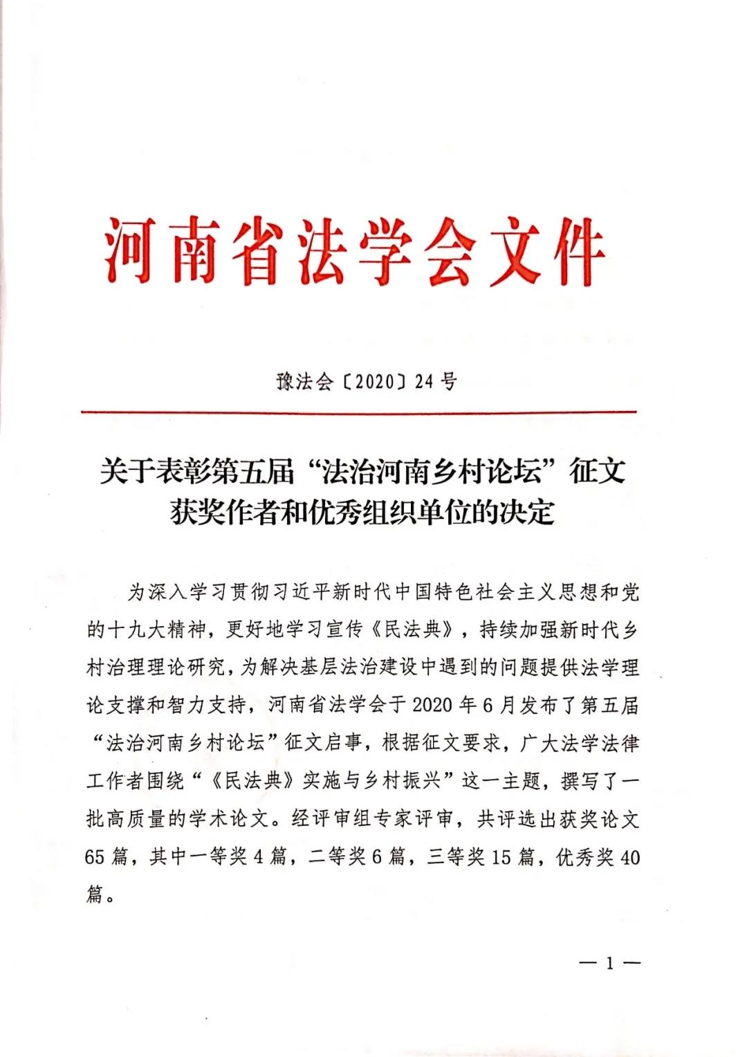 為深入學習貫徹習近平新時代中國特色社會主義思想和黨的十九大精神,更好地學習宣傳《民法典》,持續(xù)加強新時代鄉(xiāng)村治理理論研究,為解決基層法治建設中遇到的問題提供法學理論支撐和智力支持,河南省法學會于2020年6月發(fā)布了第五屆“法治河南鄉(xiāng)村論壇”征文啟事,根據征文要求,廣大法學法律工作者圍繞“《民法典》實施與鄉(xiāng)村振興”這一主題,撰寫了一批高質量的學術論文。經評審組專家評審,共評選出獲獎論文65篇,其中一等獎4篇,二等獎6篇,三等獎15篇,優(yōu)秀獎40篇。