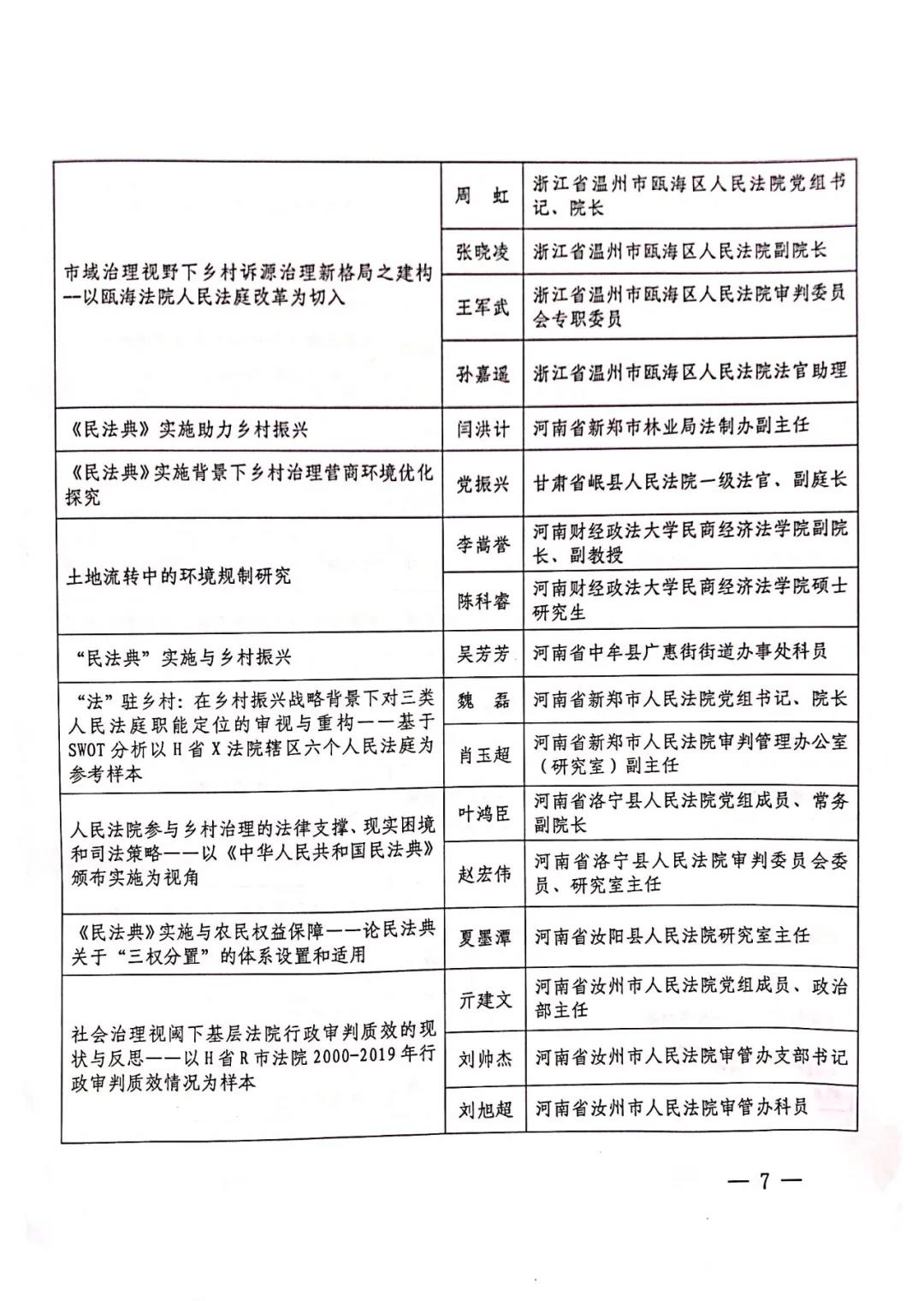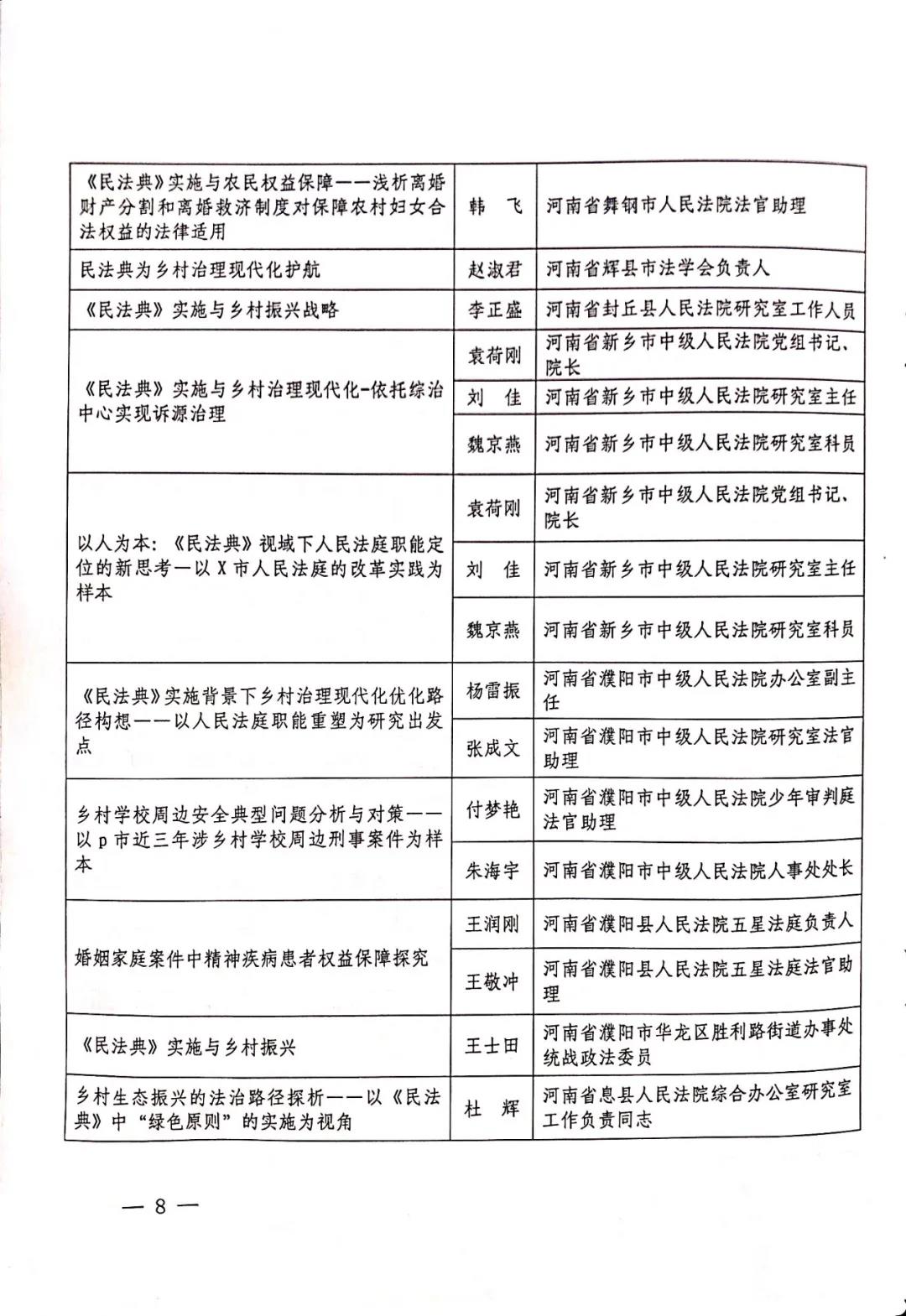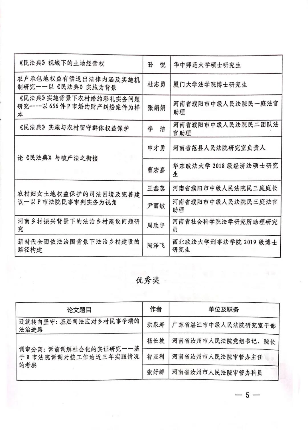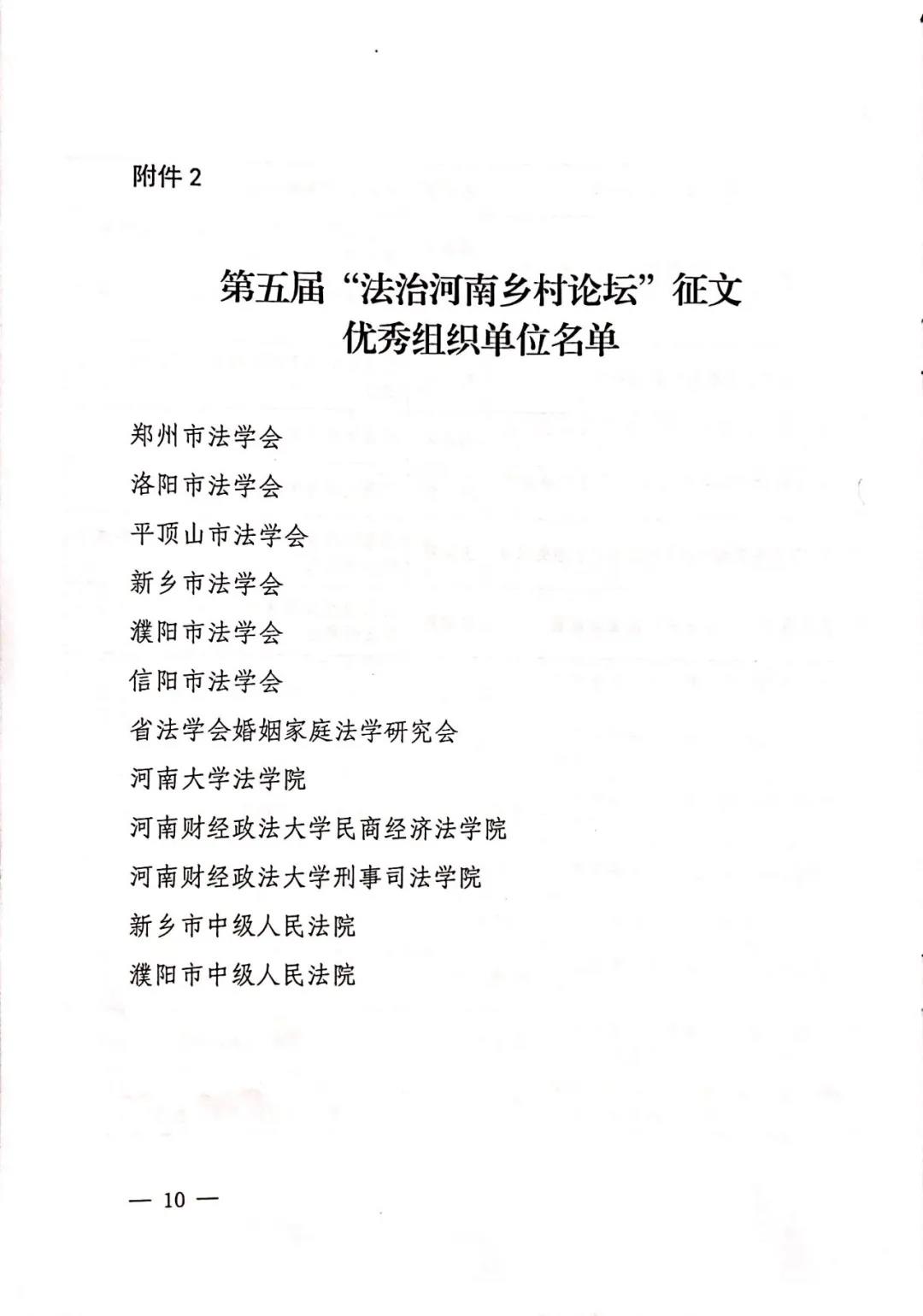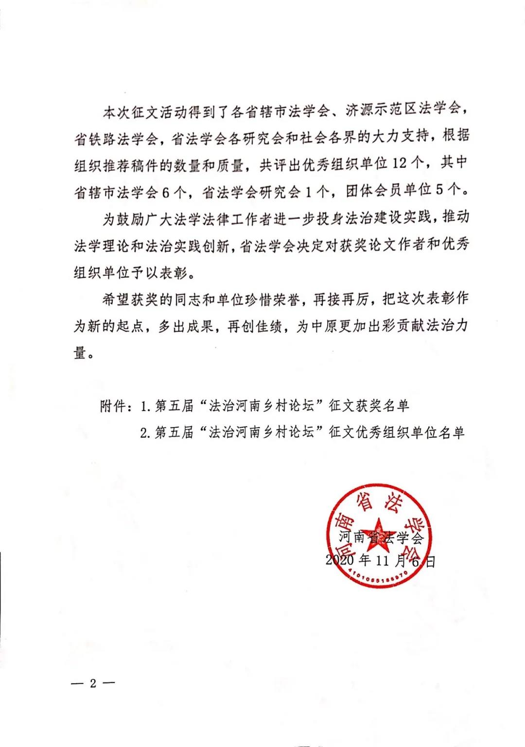 為深入學習貫徹習近平新時代中國特色社會主義思想和黨的十九大精神,更好地學習宣傳《民法典》,持續(xù)加強新時代鄉(xiāng)村治理理論研究,為解決基層法治建設中遇到的問題提供法學理論支撐和智力支持,河南省法學會于2020年6月發(fā)布了第五屆“法治河南鄉(xiāng)村論壇”征文啟事,根據征文要求,廣大法學法律工作者圍繞“《民法典》實施與鄉(xiāng)村振興”這一主題,撰寫了一批高質量的學術論文。經評審組專家評審,共評選出獲獎論文65篇,其中一等獎4篇,二等獎6篇,三等獎15篇,優(yōu)秀獎40篇。
